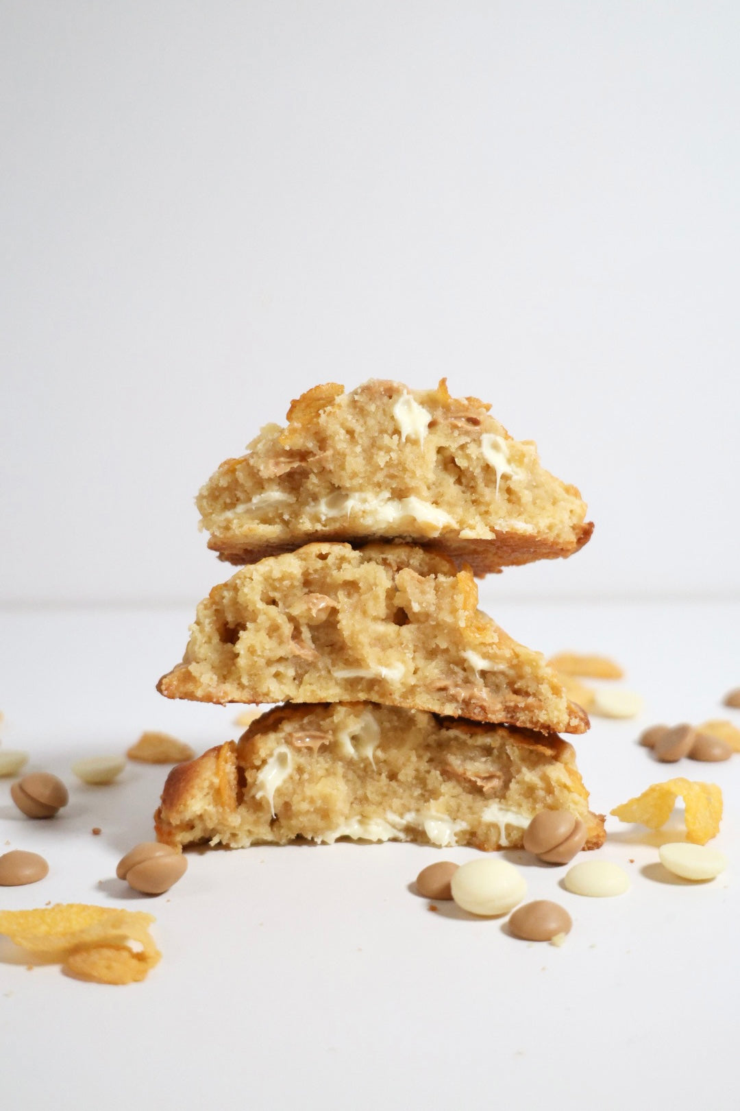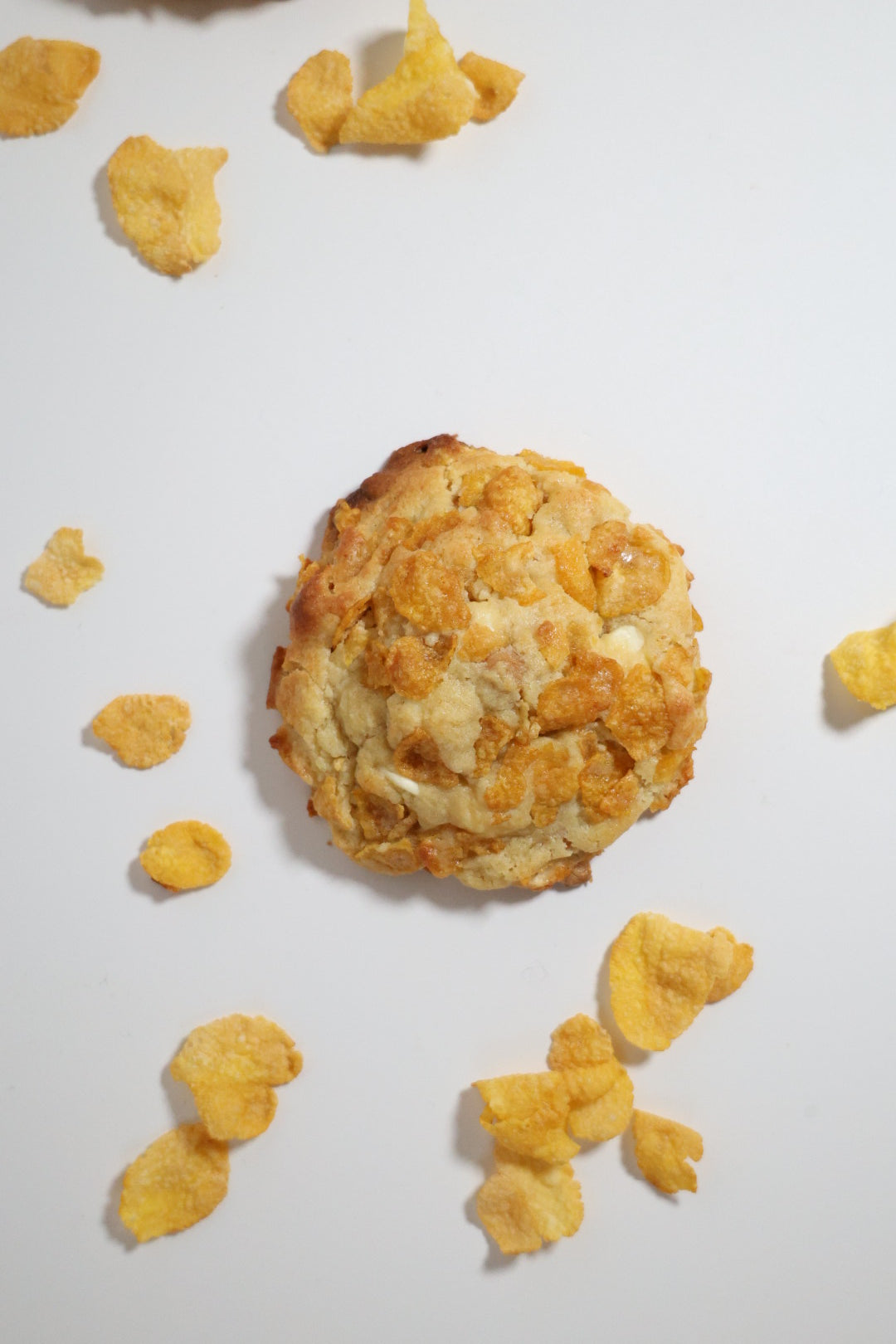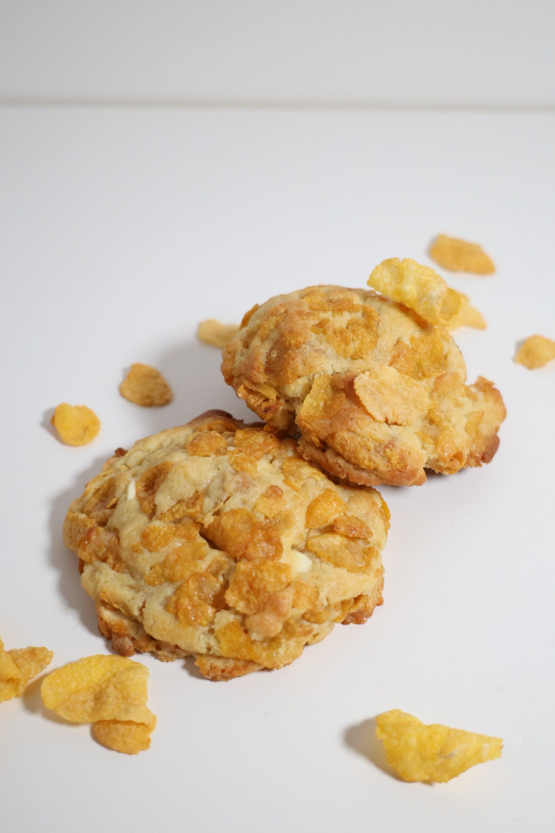 Milk powder, sweet corn powder, caramelized white chocolate chips, white chocolate chips, vanilla extract, corn flakes, malted milk